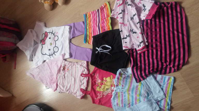Белая футболка с Китти (есть мало заметные пятнышки) на 3 года, лосины фиолетовые на 3 года в отличном состоянии, косынка в отличном состоянии, майка с русалкой (немного стерта наклейка) на 2-3 года, Юбка полосатая в отличном состоянии на 2-3 года, шорты черные в хорошем состоянии 2-4 года (отлично для физ-ры в сад), топик с собакой на 2-3 года, наклейка немного помята,пижама (брюки плюс кофта с длинным рукавом) на 4 года примерно в хорошем состоянии, полосатая моднявая футболка в отличном состоянии на 3 года, голубая кофта в хорошем состоянии, но скорее для дома.