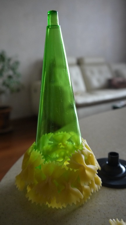 3. Как приклеили все макароны, берете вторую ножку и приклеиваете ее клеем момент к ножке, которая уже приклеена к бокалу (см.фото ниже). Получается очень устойчивая подставка для ёлочки)