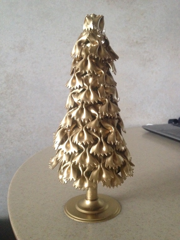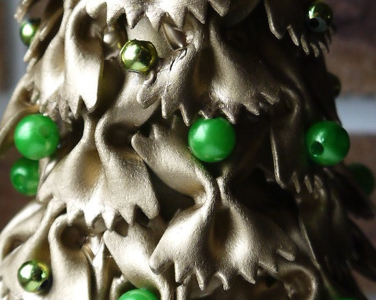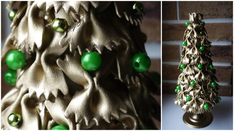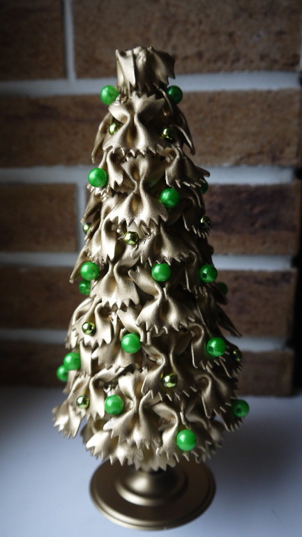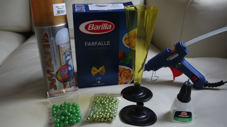 И так, что Вам потребуется: 1. Основа под елку-это одноразовый бокал с ножкой (продаются везде)+еще одна ножка 2. Макаронные изделия в виде бантиков (можно использовать макароны в форме перьев, тоже красивая елка получается) 3. Клеевой пистолет 4. Балончик с краской (любой, любого цвета, зависит от Вашей фантазии) 5. Украшения для ёлочки (я использовала обычные дешевые бусинки 2-х размеров приклеивала их уже на клей супер момент)