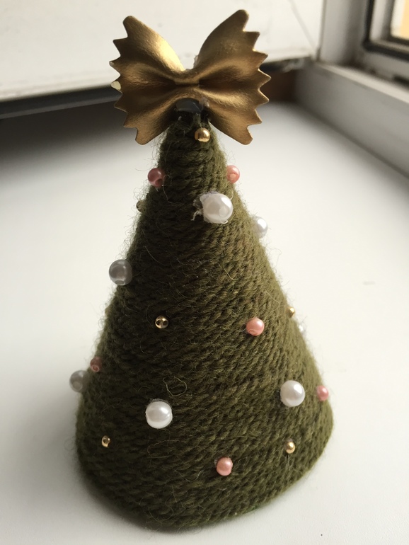 Эта ёлочка на скорую руку сделана из картонного конуса,обмотана нитками для вязания,украшенная обычными бусинами и макарониной (ее покрасила сначала,потом приклеила горячим пистолетом) в качестве макушки вместо стандартной звезды))) З.Ы. Может пригодиться кому в качестве совместной поделки для садика)