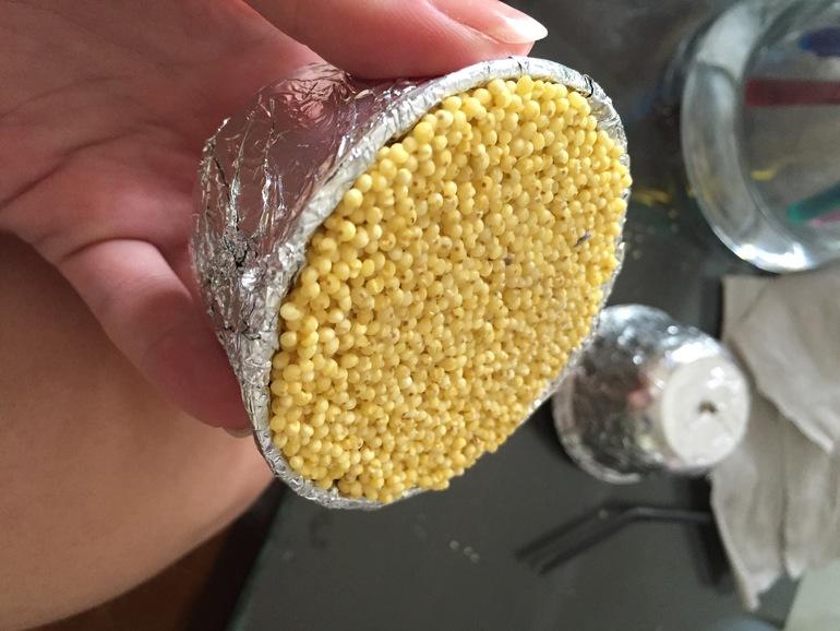 Так как инопланетный гость получился совсем не маленький и вес у него приличный, надо его поставить на что-то, что будет его держать в вертикальном положении) Я взяла крышки от детской сладости в стакане, по моему финетти называется) но можно использовать что угодно, что есть под рукой) Смешала клей пва+пшено, залила эти крышки и дала им сутки на высыхание. Получились такие ноги/ботинки)
