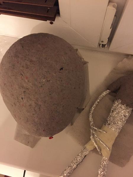 Когда все тело готово-соединяем тело с ботинками/ногами. Голову я прикрепила на саморез и задекорировала папье-маше, тем самым получилась шея) Но вот, все готово! Заклеиваем глаза (пластик) бумажным скотчем и красим нашего инопланетного гостя краской из баллончика)