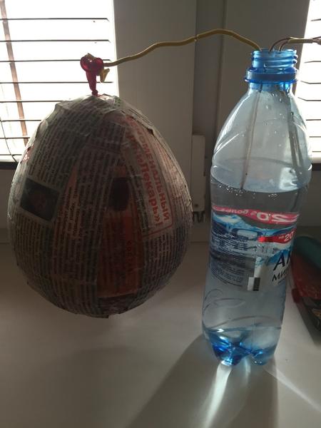 Голова наша высохла, тело в процессе. Делаем глаза) Я купила квас, у бутылки была очень интересная форма и я из нее вырезала два глаза, затем каждый глаз приклеила к голове все той же массой папье-маше. Слепила нос и губы)