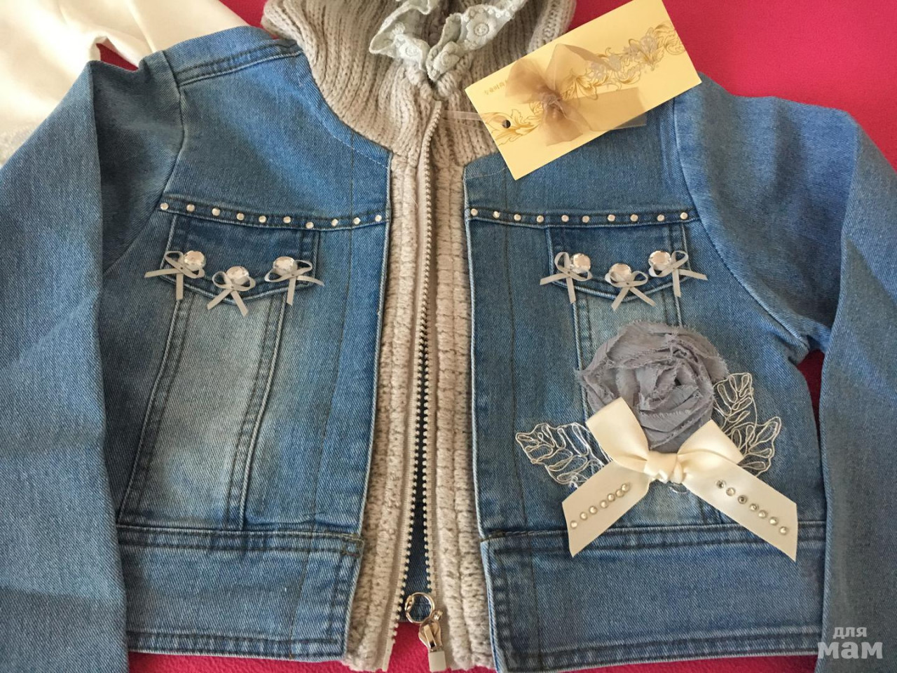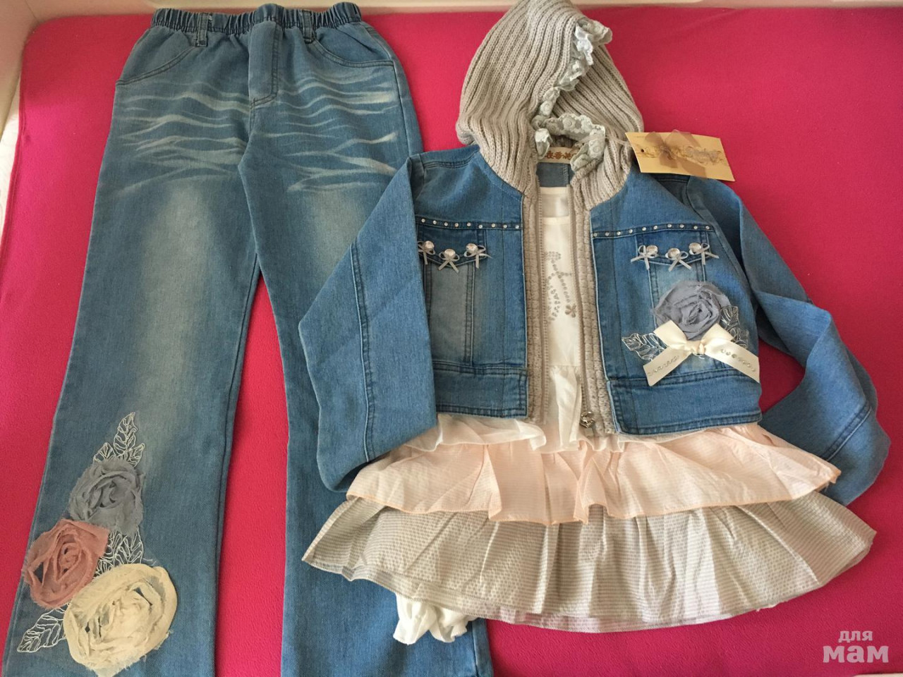 Джинсы: длина – 81/58см., талия (на резинке) - 26см. Джинсовая куртка с вязаным капюшоном: длина ¾ - 33,5см., полуобхват груди - 39см., внутрен.рукав – 36см. Лонглив, кофта с длинным рукавом, плотный трикотаж: длина - 49см., полуобхват груди - 35см., внутрен.рукав – 34см. Цена: 2500 руб.