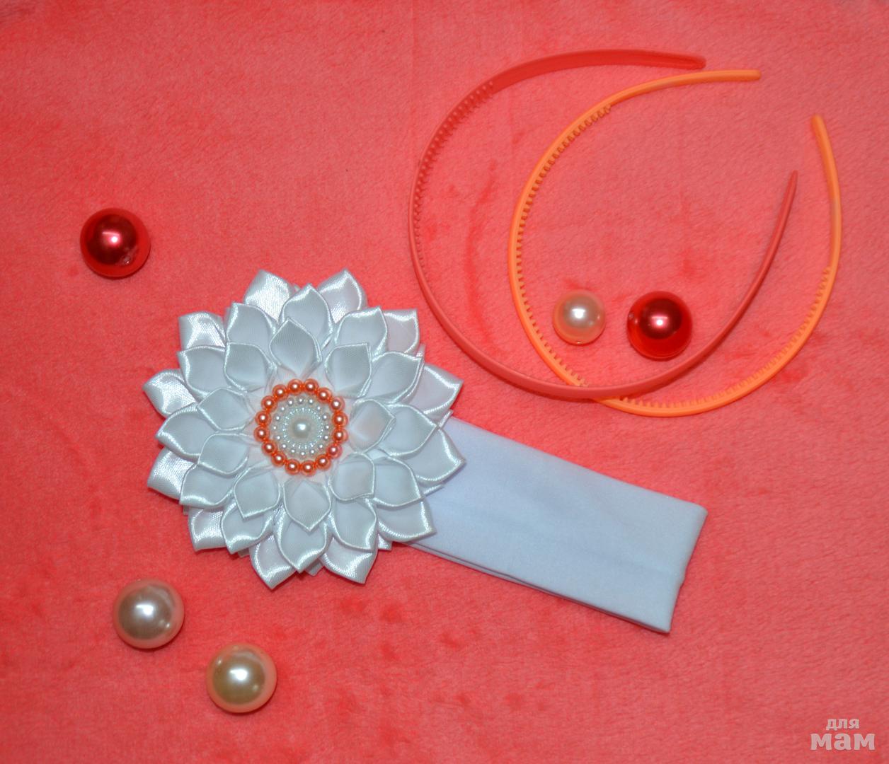 Повязка с цветком из атласной ленты (диаметр цветка 12 см).