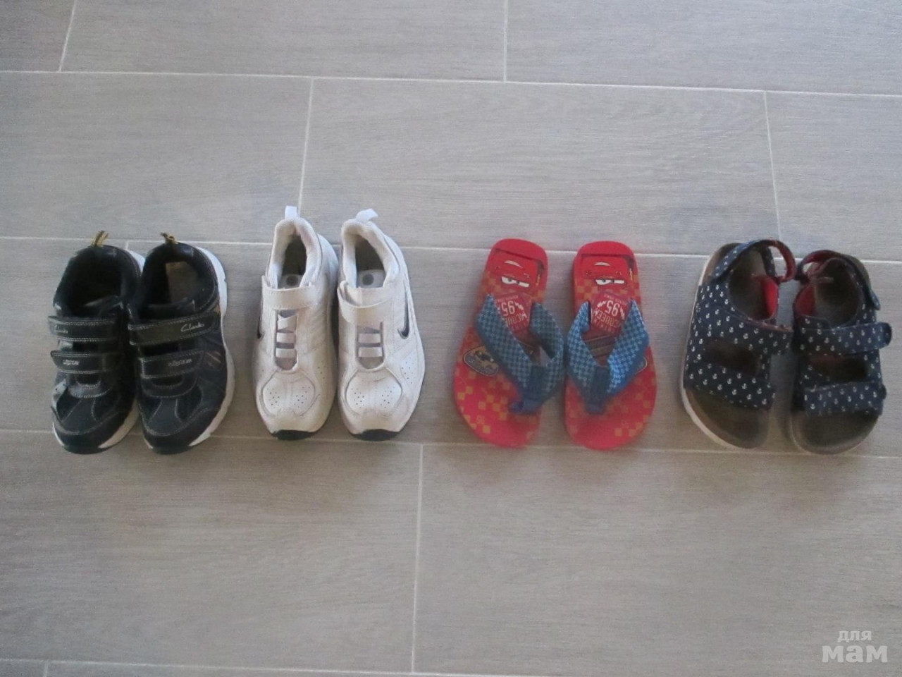 Отличное состояние.Сlarcs тёмно-синие,мигают динозаврики,обувались два раза-1200 руб..Nike-900 руб..Сланцы-300 руб..Сандалии,ортопедическая стелька(на фото стелька темнее получилась)-800 руб..