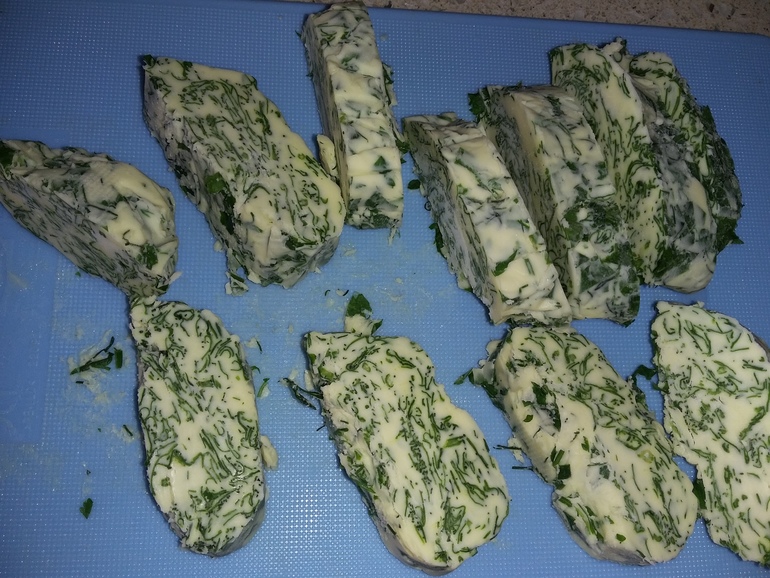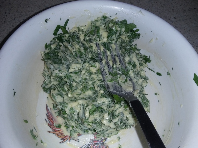Отрезать брусок зеленого масла и сложить в сформированную длинную котлетку: