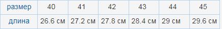 размер: 40-26.6 см 41- 27.2 см 42 -27.8 см 43 -28.4 см 44- 29 см 45-29.6 см