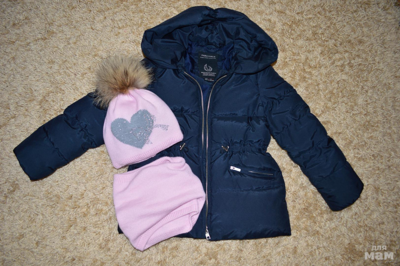 4. комплект: куртка zara, наполнитель пух и шапочка утепленная (помпон на кнопке) со снудом.