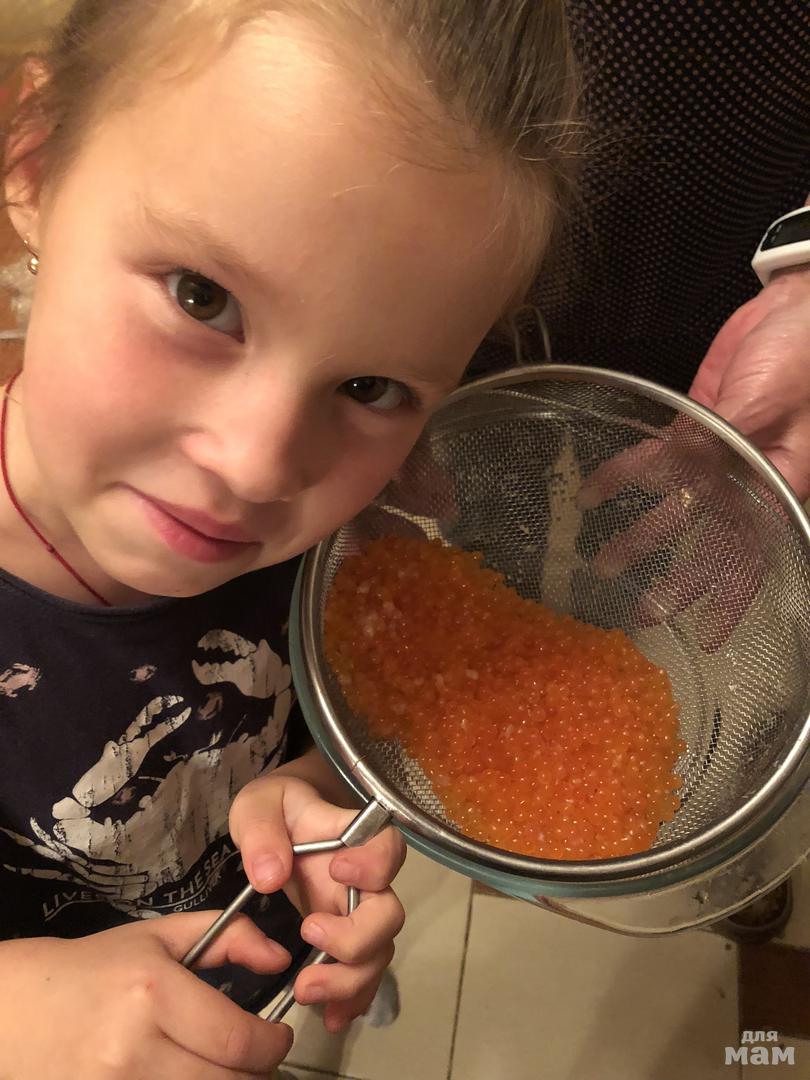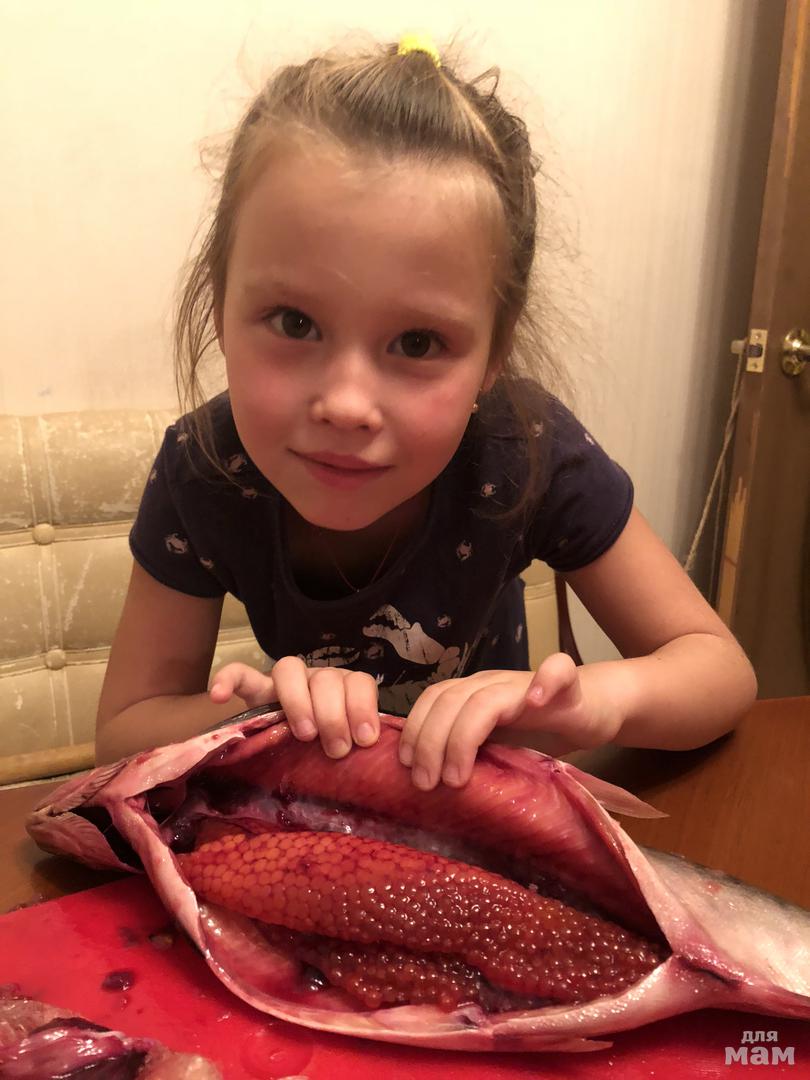 Первый раз в жизни купили непотрошонную по Акции) рыбка вышла на 130 рублей). И нашли там икорку. По ощущениям грамм 150, засолили и почти всю съели). В нашем доме икру любит только дочка. При чем с самого детства. Муж может когда очень голодный съесть бутербродик, а я даже если буду умирать с голоду, икру есть не стану)))