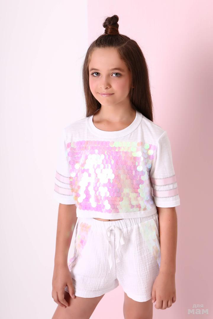 1893 шорты котон-жатка, паетка монеты-перламутр 140-164 белый5% лайкра 5% вискоза 90% хлопок цена 18,81 + орг