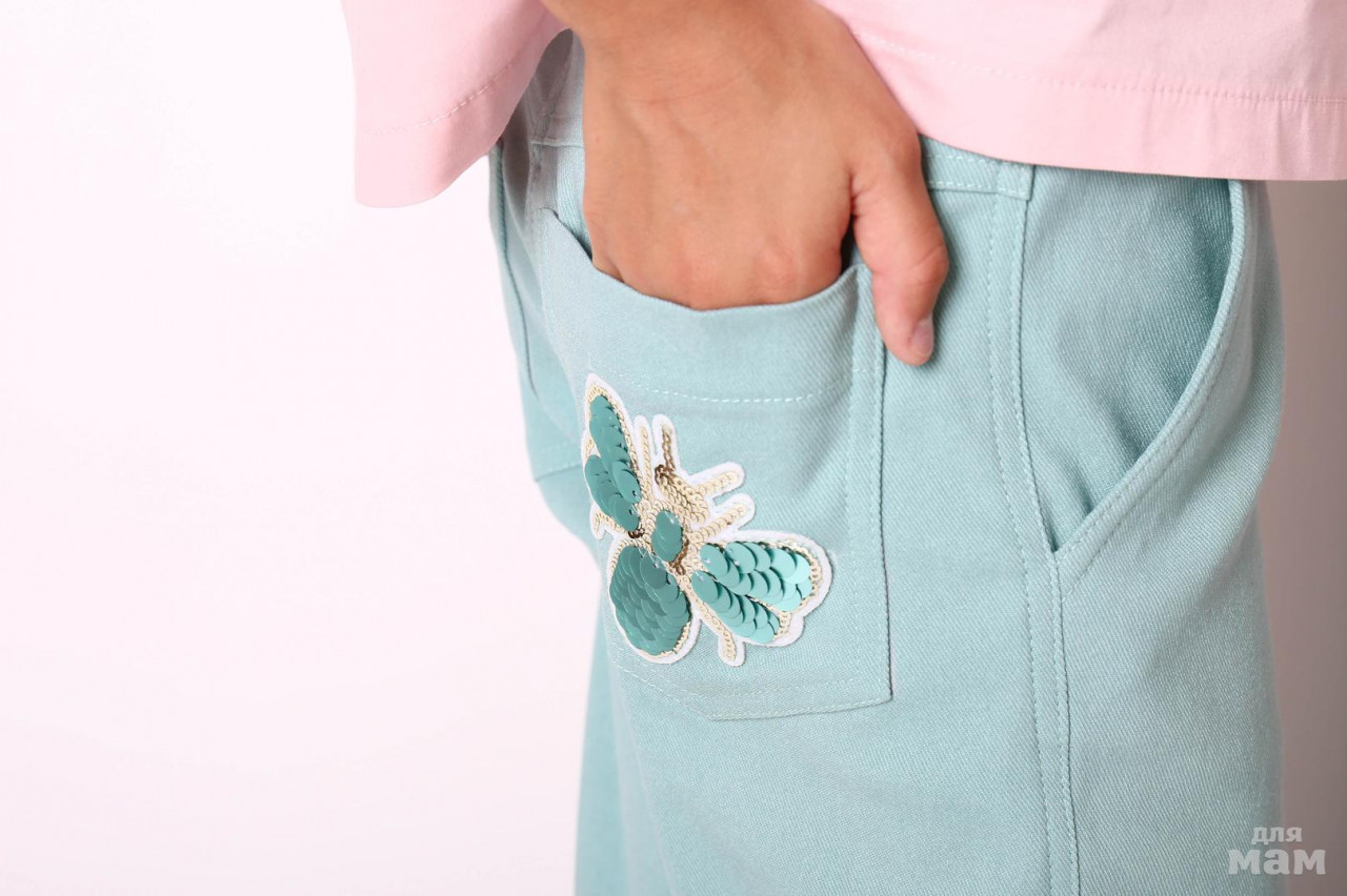 1902-1 брючки, джинс стрейч однотон, макраме 110-134 ментол 60% хлопок 30% синтетика 10% лайкран цена 35,91 + орг