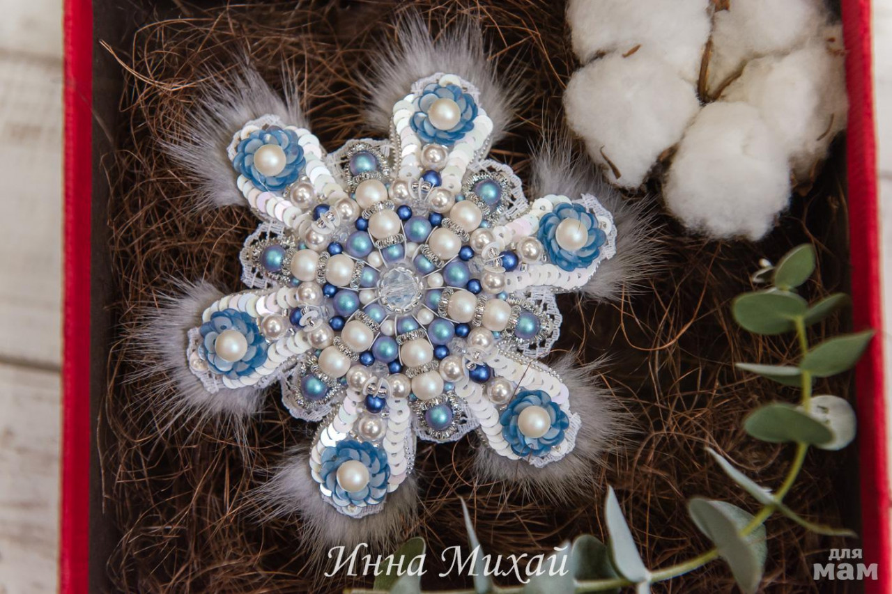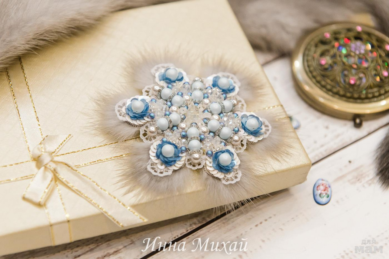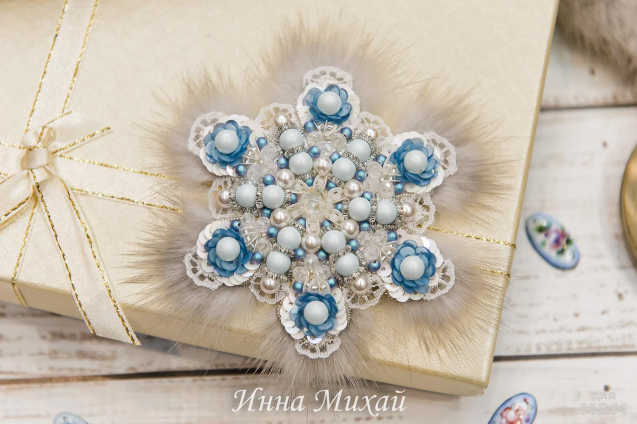 19. Эта брошь сделана на заказ и продана. Заказчица поставила конкретную задачу. Чтоб снежинка была из бусин Сваровски, с кружевом и норкой и чтоб смотрелось свежо и стильно, я думаю у меня получилась, вы как считаете?. Использовала полностью из бусин Сваровски, канитель, итальянские пайетки, натуральная норка, изнанка - кожа серебряного цвета и японская булавочка. Без повтора.