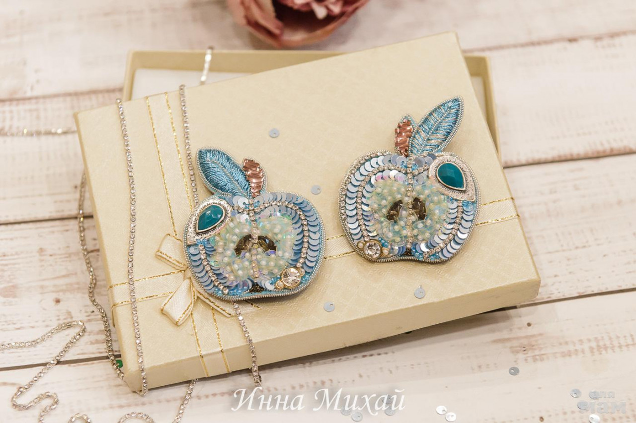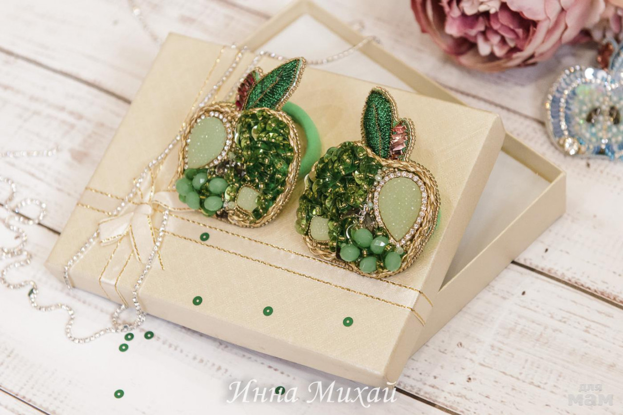 28. Броши яблочко. Итальянские пайетки, стразовая цепочка, изнанка - кожа и японская булавочка.