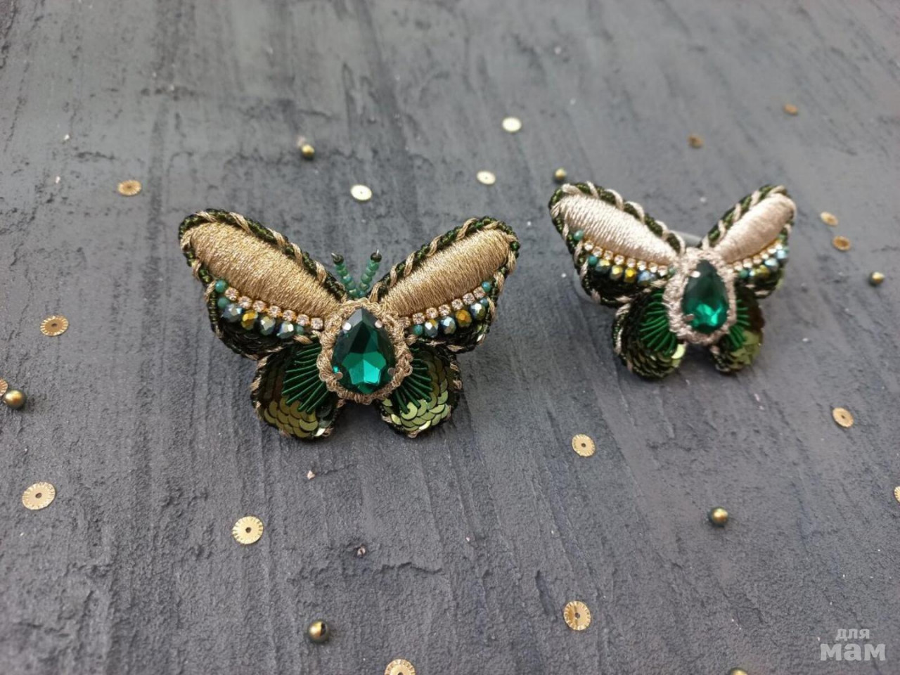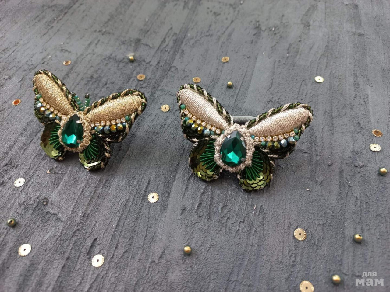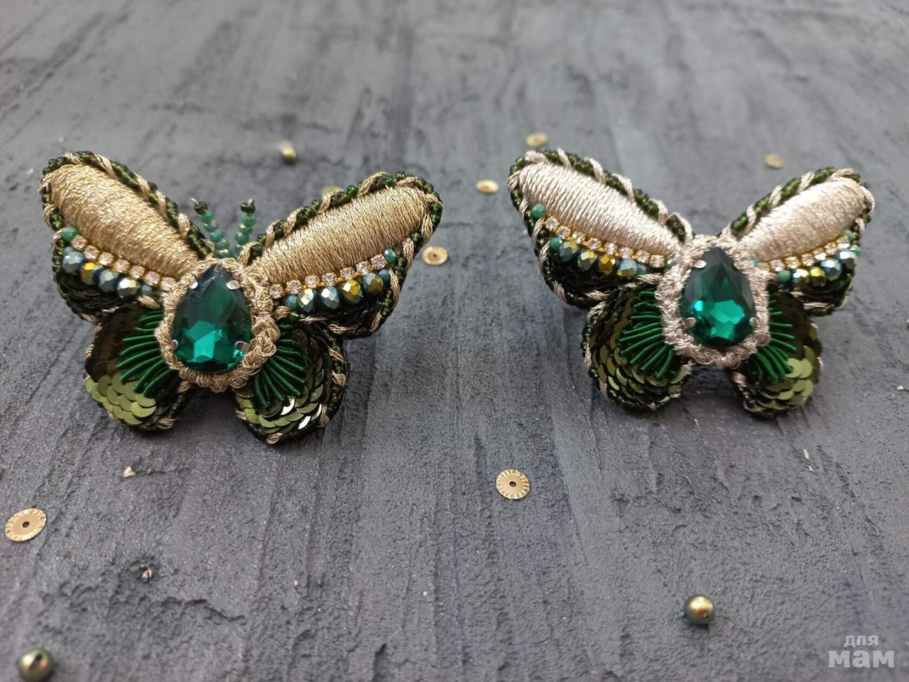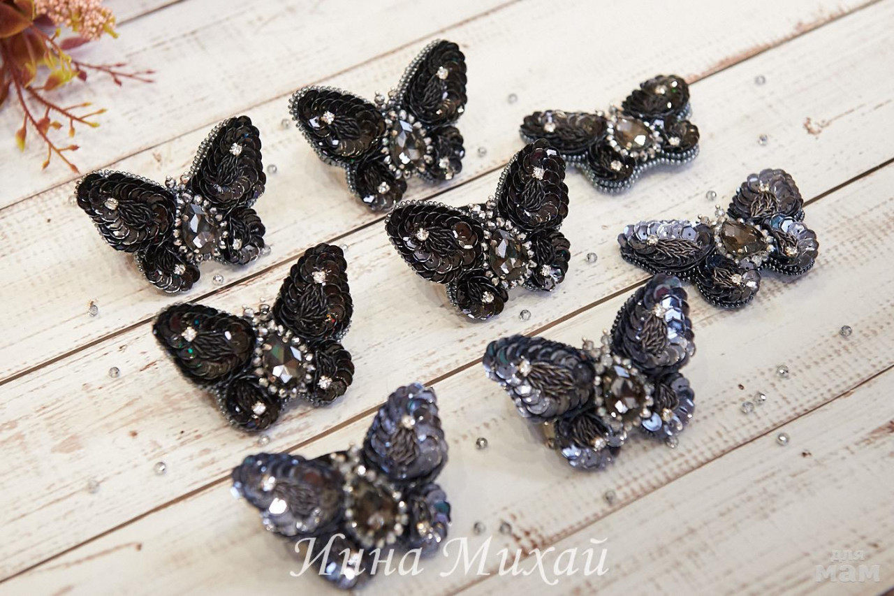 10. Бабочки. В работе использовала разные техники, материалы - кристаллы, блестящие нити для вышивки ( на фото не видно, вся эта красота невероятно блестит), итальянские пайетки, стразовые цепочки). Изнанка может быть по вашему выбору - или броши, или заколки, или резинки. 800 руб одна бабочка. На заказ.