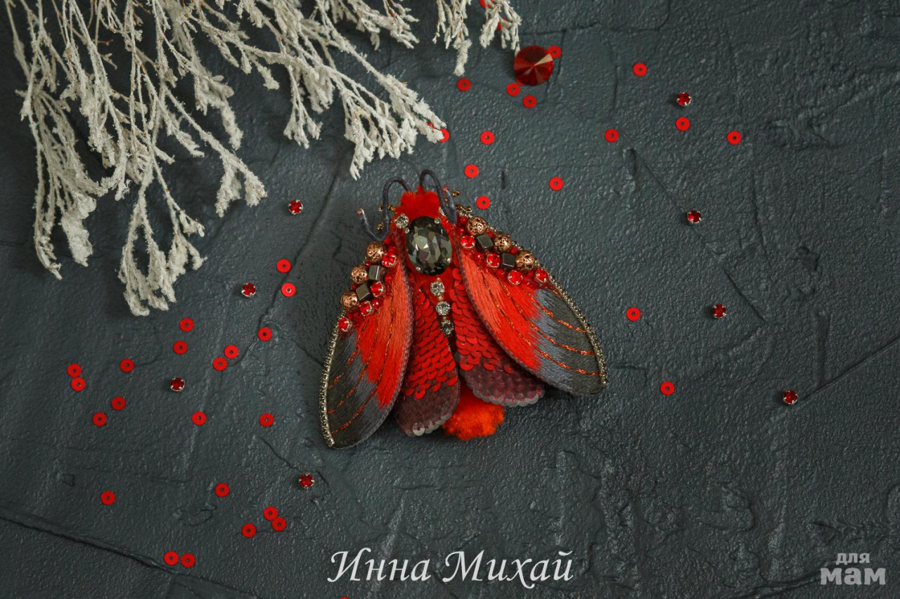 1. Мотылёк - брошь. Этот мотылек вышит хлопковыми нитками, использованы кристаллы и бусины Сваровски. Пайетки Италия. Натуральные камни. Мотылек не мелкий, но лёгкий. Подойдет даже на лёгкие блузы. А уж на плотной одежде (пальто, жакеты) смотрится просто волшебно. Изнанка крылышек - натуральная кожа.