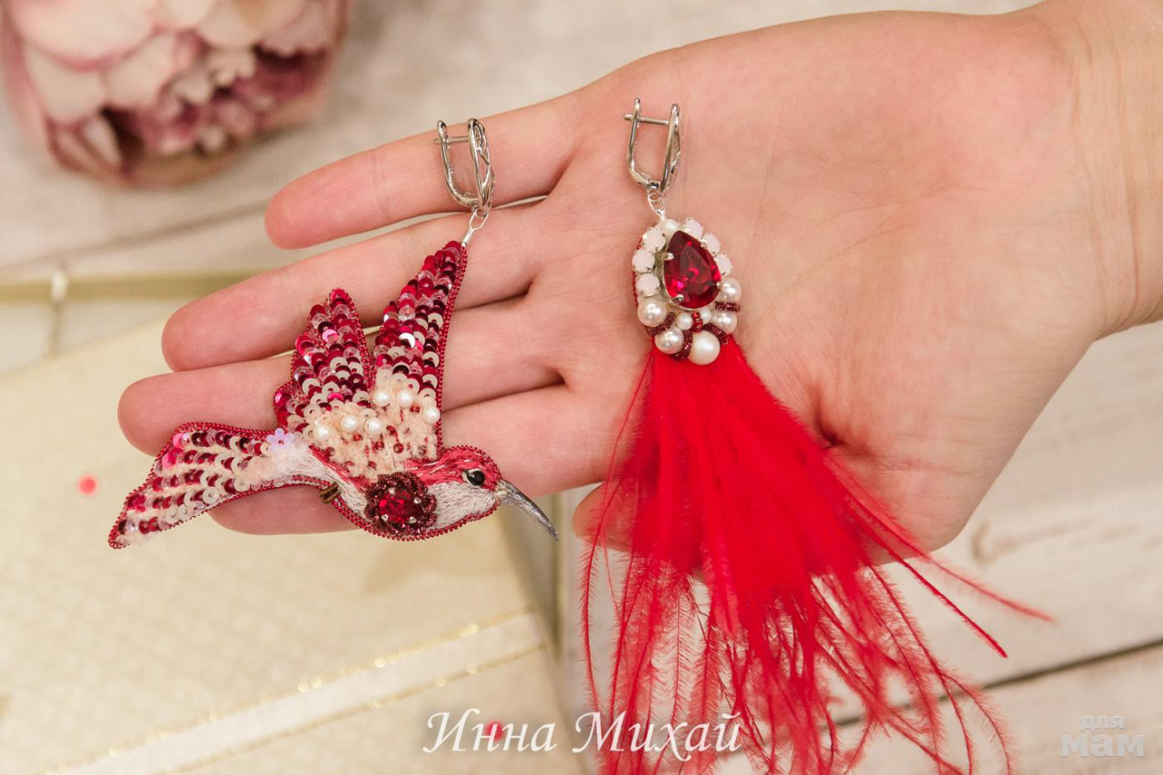 27. Асимметричные серьги. Использовала лучшие материалы Французские пайетки, кристаллы и бусины Сваровски, канитель, страусиные перья, корейские швензы - гипоаллергенные, отличное крепление. Изнанка - натуральная замша красного цвета. Серьги очень лёгкие.Проданы.