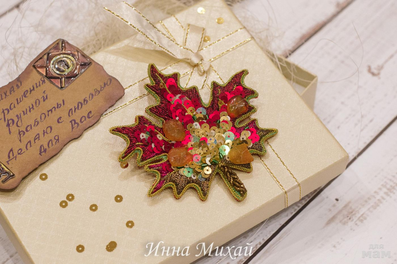 16. Брошь " Осенний лист" На заказ. 1600 руб + 250 руб доставка. Размер с веточкой 9*8 см. Вышит канителью, итальянскими пайетками, стеклярусом, кристаллами, бисером, блестящими нитями для вышивки. Обратная сторона - натуральная кожа с японской булавочкой. Сейчас во многих своих украшениях я использую эти булавки. Они хотя и дорогие, но зато качество просто на высоте. Не меняют цвет, не оставляют на ткани проколы и очень качественный поворотный механизм. С застёжкой. На мониторе ноутбука край листа почему - то с малиновым отливом(((, на мониторе стационарного компьютера край листа как и есть, ярко красный, поэтому цвета на вашем мониторе могут отличаться от цветов в жизни из-за настройки цветопередачи вашего монитора