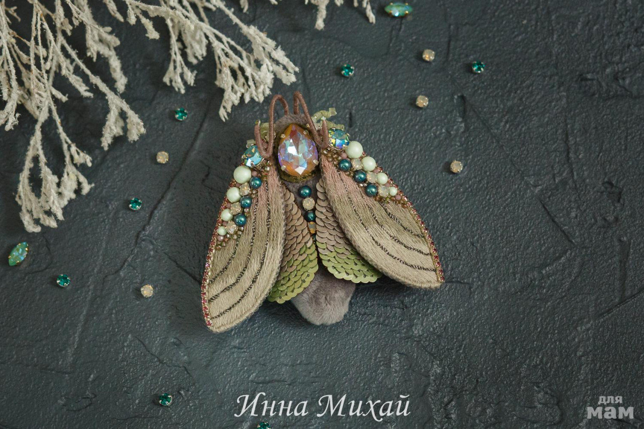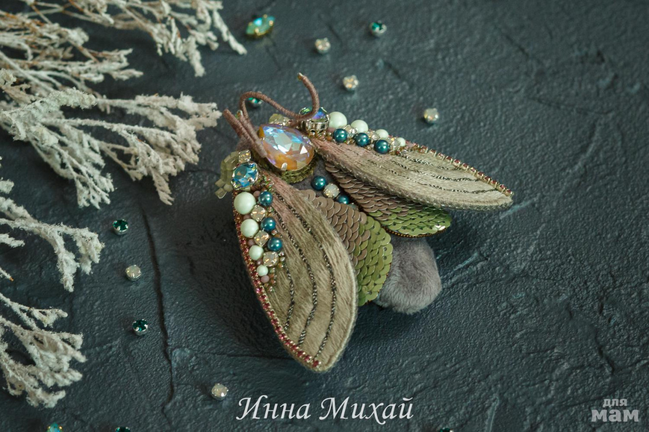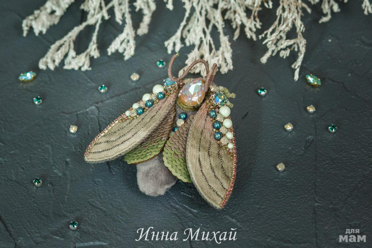 4. Брошь цикада Вышивка тончайшей шерстью, все бусины и кристаллы Сваровски, на брюшке винтажная финифть и винтажный сатиновый бисер. Изнанка крылышек - натуральная кожа, крепление - японская булавка. Брошь очень лёгкая. Размер броши 7×9 см ( без учёта лапок и усиков)
