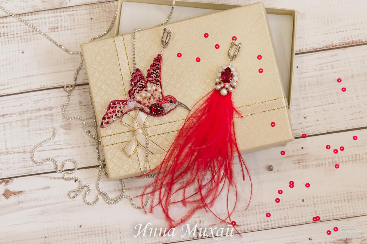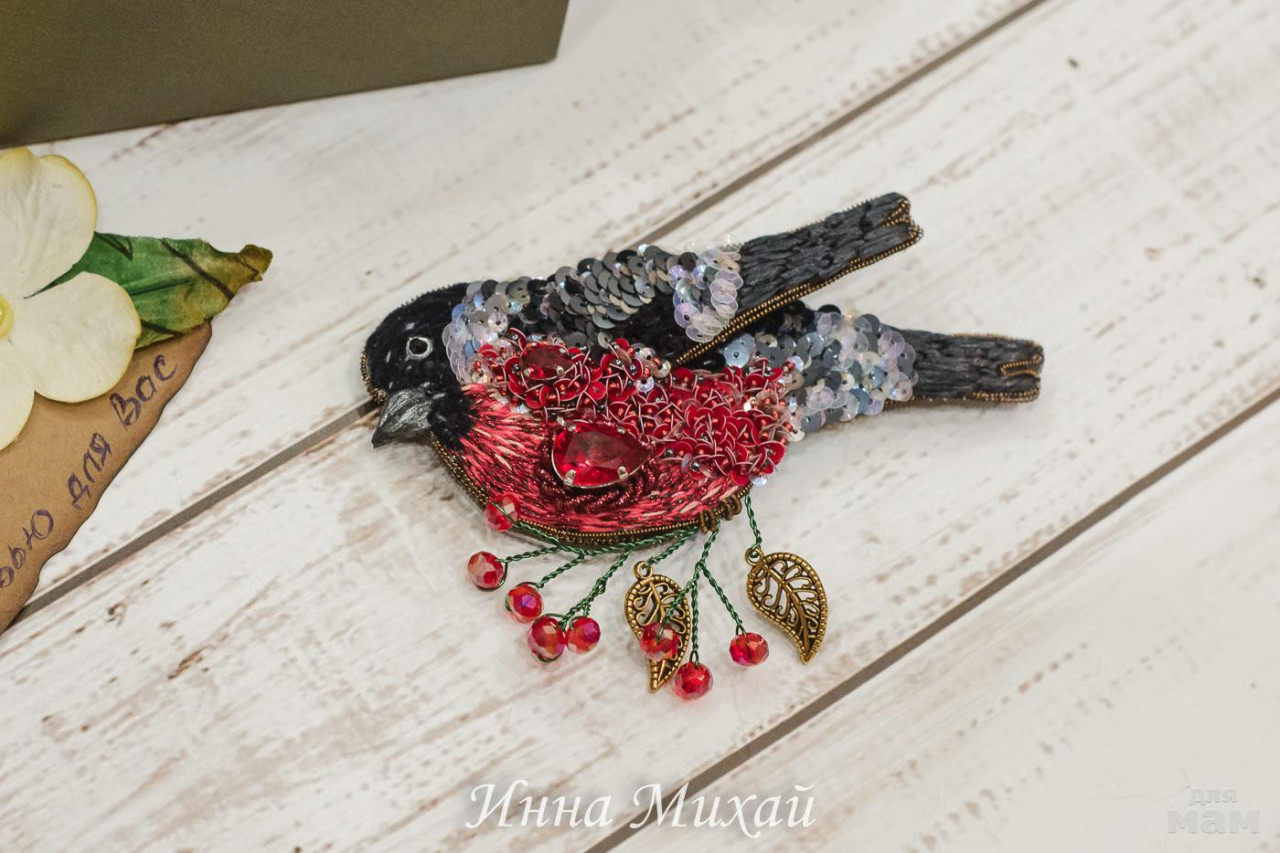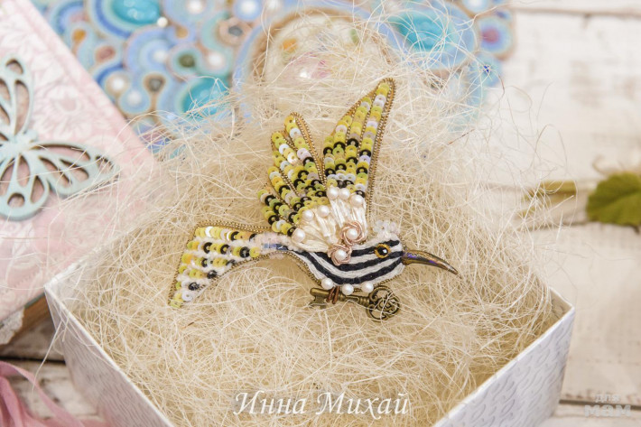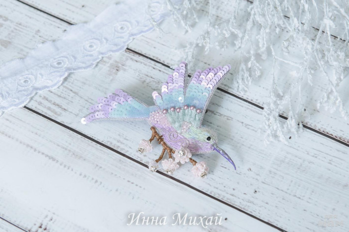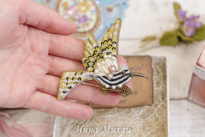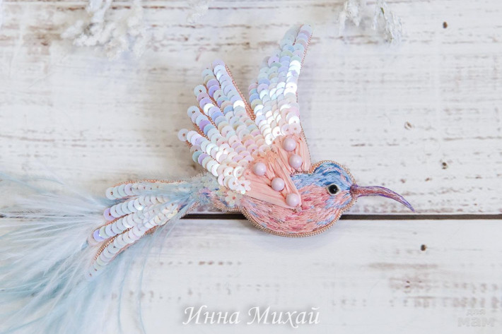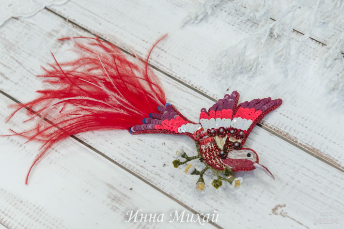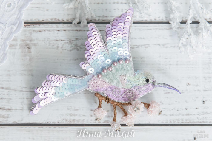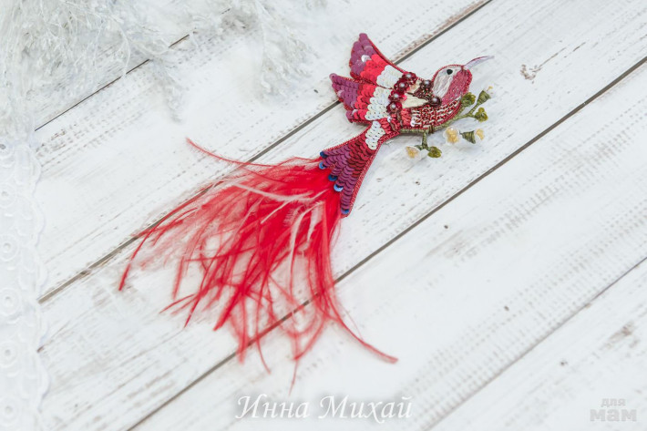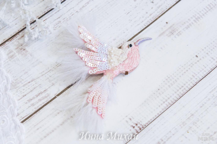 15.Материалы - кристаллы Сваровски, синель, канитель, рафия, французские и итальянские пайетки, нитки для вышивки, бусины. Размер птички 10,5* 5 см