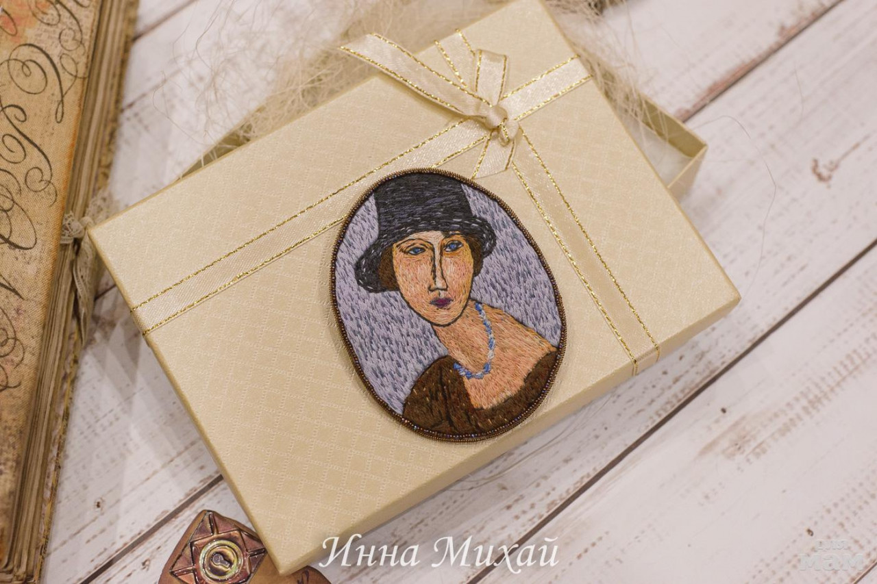 17. Брошь вышитая гладью по мотивам картины Амедео Модильяни. На картине изображена его любовь Жанна Эбютерн ВОТ ЗДЕСЬ я более подробно описывала на чём основывался мой выбор этой работы. Брошь вышита хлопковами нитями мулине, обрамлена микробисером, канителью. Обратная сторона - натуральная кожа и иголочка японского производства.Размер броши 8*6,5 см. Брошь продана. Без повтора.