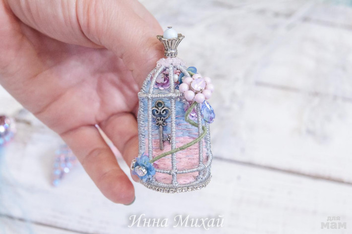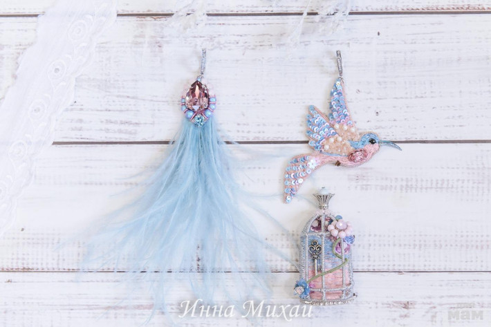 32. Вот такой комплект придумала моя постоянная заказчица. А я возьми, да и сделай ))) Это асимметричные серьги и брошечка - клетка. Брошь объёмная. Как настоящая клеточка. Только без птички. Птичка выпорхнула ))) Зато в клеточке полно кристаллов Сваровски, цветочки из французских пайеток и вообще много всякой красоты. Видео обязательно позже покажу.