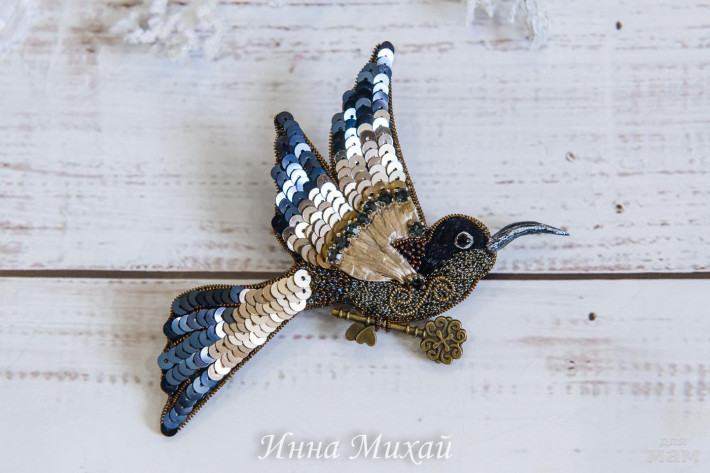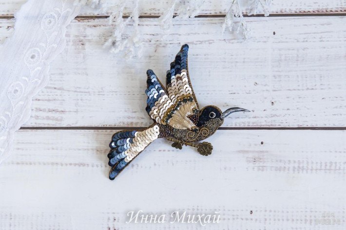 13. Брошь. Использовала лучшие материалы - кристаллы и бусины Сваровски, французские пайетки, канитель, японский бисер, изнанка - натуральная кожа. Повтор невозможен. Размер птички 7*9 см