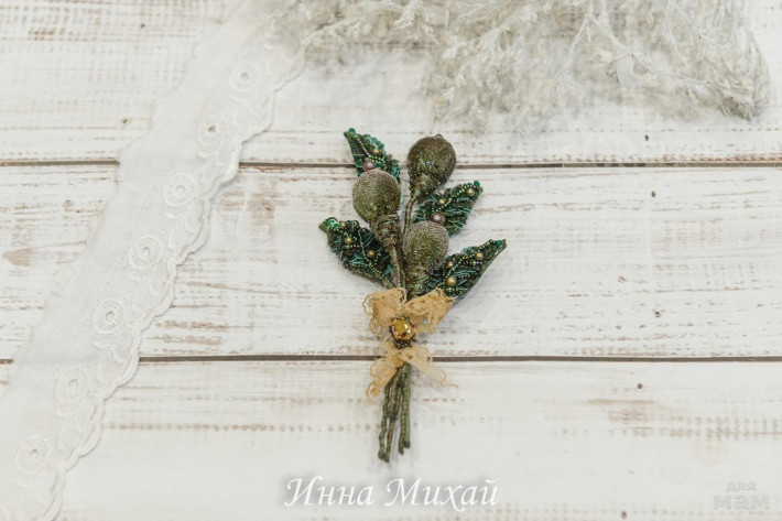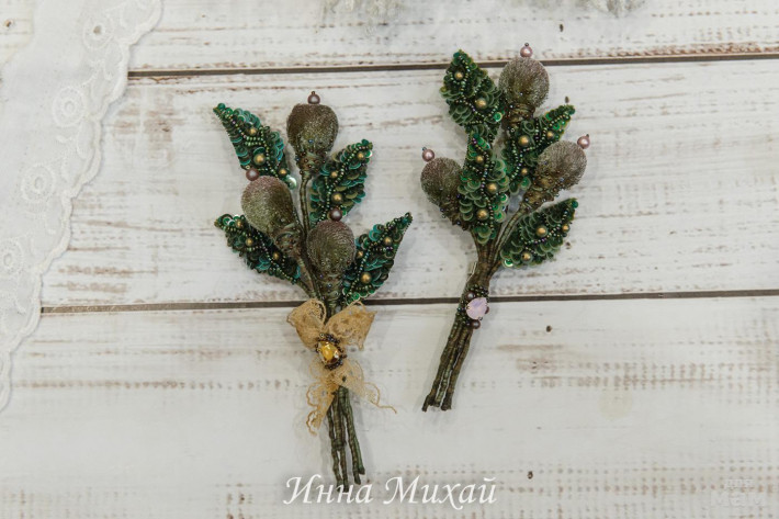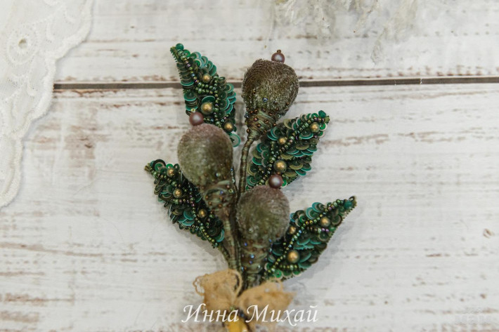 Брошь веточка. Использовала бусины и кристаллы Сваровски, пайетки - Франция, Италия. Изнанка листиков - итальянская замша. Прикладываю её ко всей одежде и она смотрится просто в любом образе.