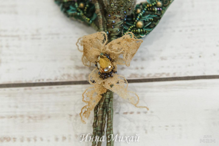 Крепление - 2 японские булавки. Одна внизу, вторая, меленькая вверху. Брошь уверенно будет держаться на одежде, не сползает и не перевешивает.