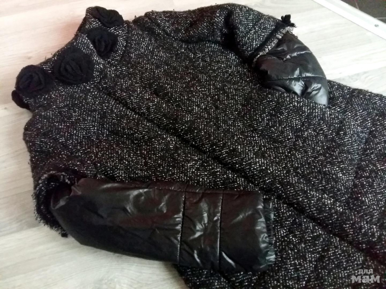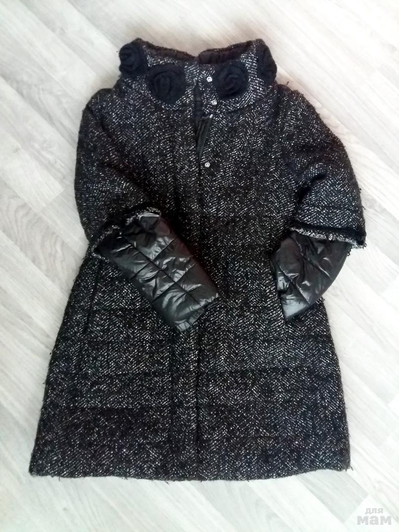 Пальто черное с вязанными розами -осень, 8 лет (128 рост), состояние идеальное! примерить возможно в Медведково, по России почта!