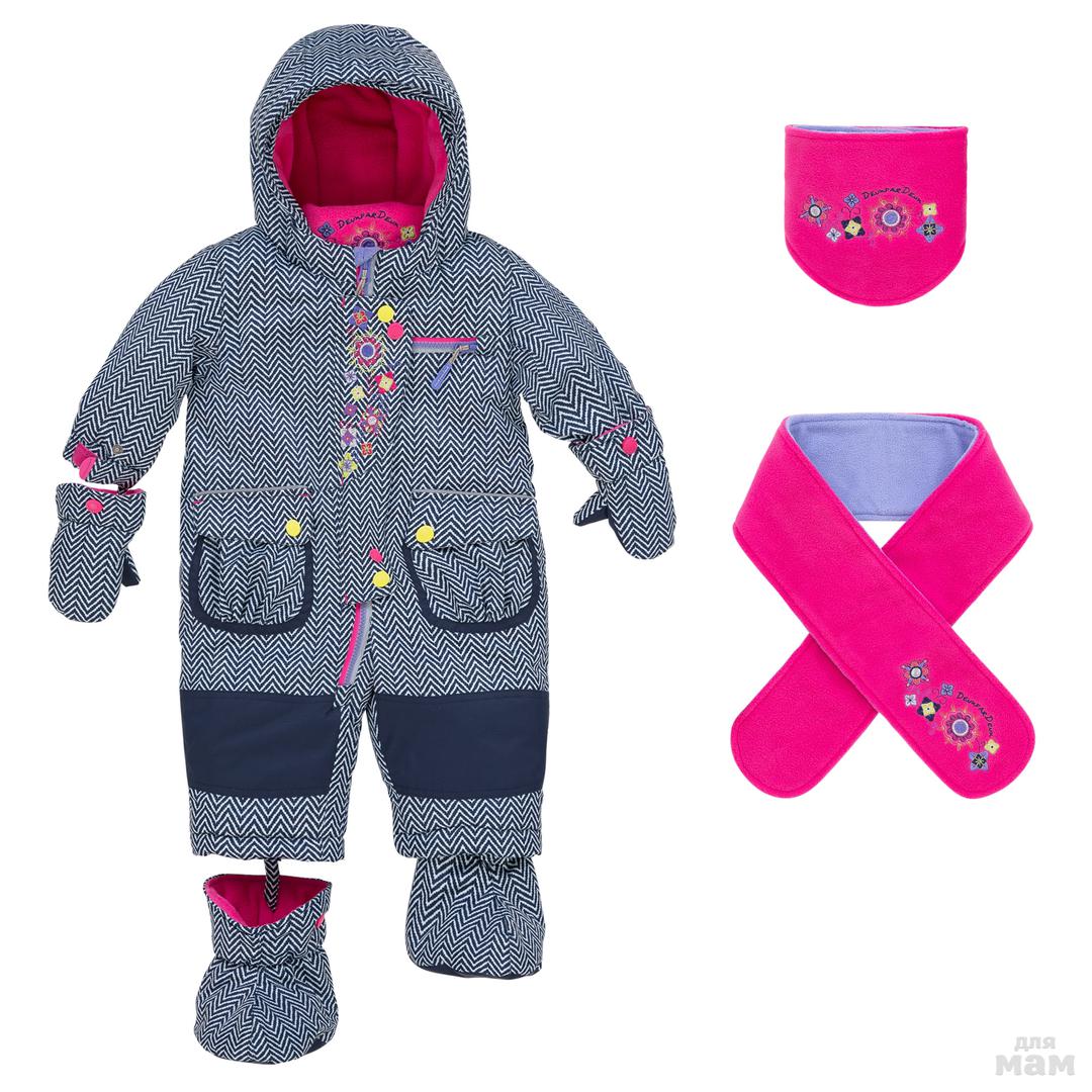 Внутреняя часть спинки, грудки и капюшона отделана флисом. Капюшон не съёмный. Пинетки на кнопках, варежки отделаны внутри флисом. В комплекте манишка и шарф выполнены из мягкого флиса с оригинальной нашивкой.