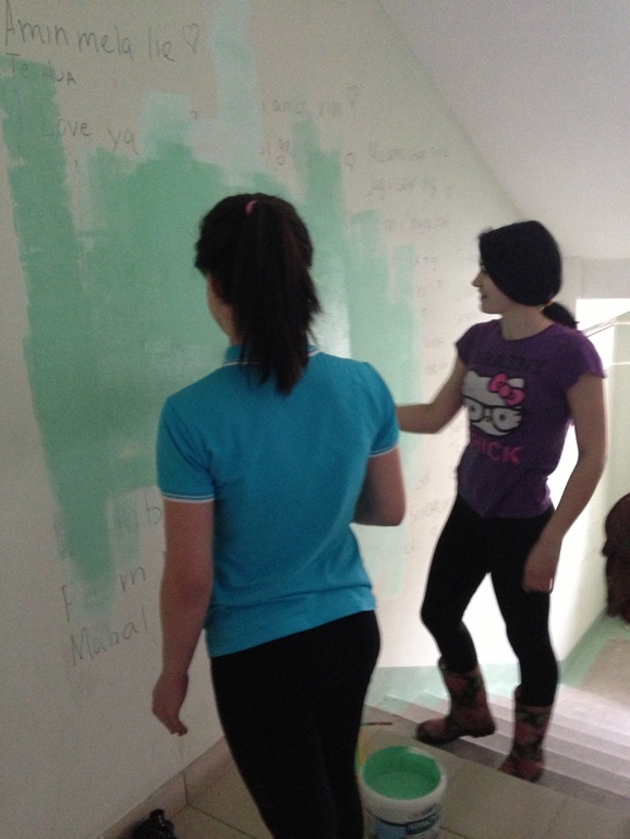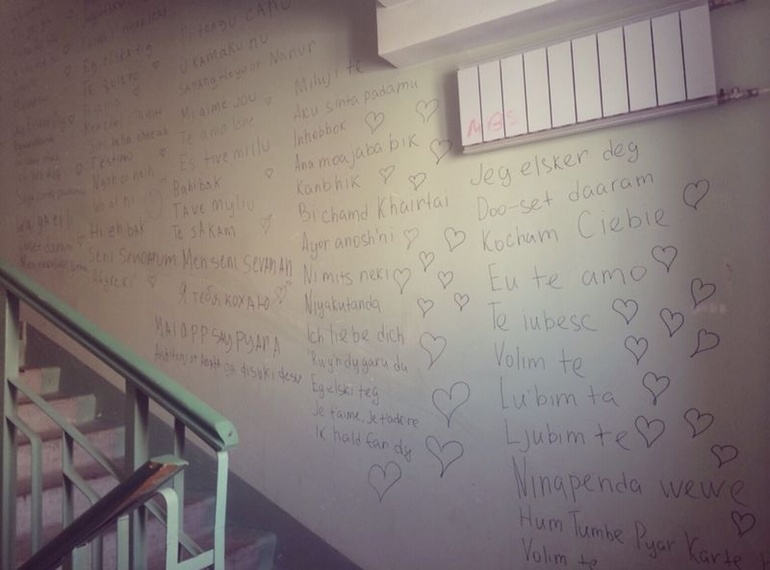 Конфетно-букетный период продолжается !!!! Выходим мы из дома, а у нас Тадам!!!! Признание в любви, на нескольких языках мира! И рядом на стене большими буквами Настя! Я тебя люблю!......говорить и чистоте нашего подъезда нет смысла, люди, поросята, собаки...девочки легкого поведения оставлявшие номера телефонов на стенах....соседи долго ждать себя не заставили, объявились тут как тут: И наш папа , строго к этому отнесся, даже срок поставил, все выкрасить до утра . И прошла моя дочь курс маляра сегодня!