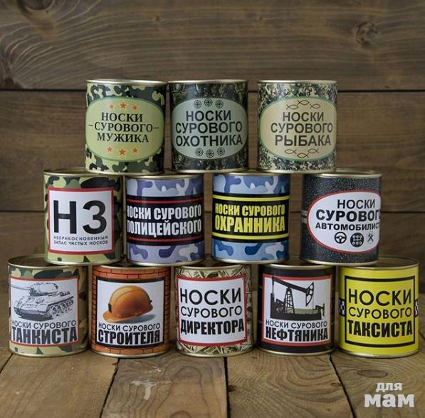 Пара носков, упакованная в "банку из-под сгущенки" с оригинальной этикеткой и шуточной инструкцией-памяткой.