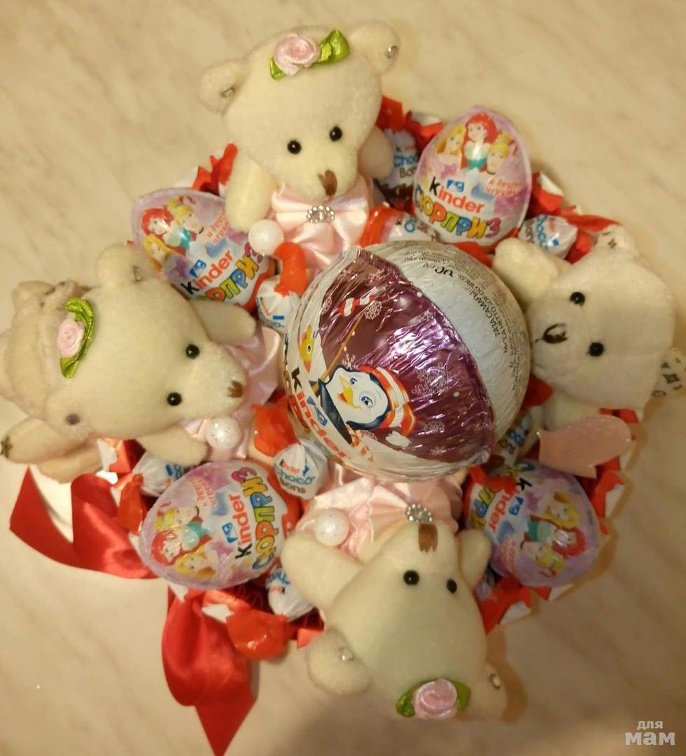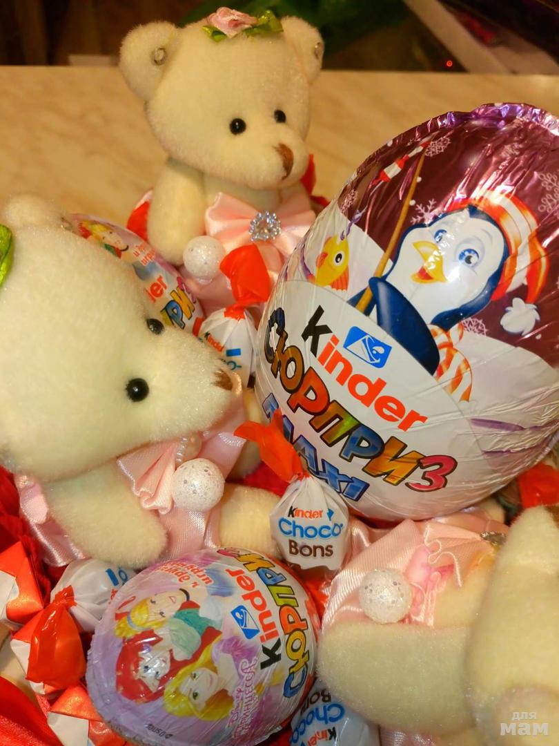 Сладкий подарок на любой праздник (в данном случае был на день рождение для девочки), продукция kinder в ассортименте и мягкие игрушки мишки