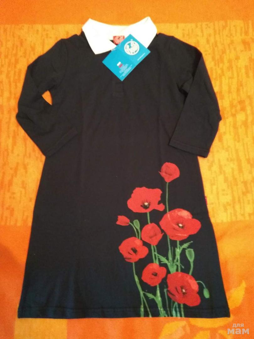 4. Трикотажное платье Апрель, размер 134, темно-синее, цветы яркие, полноразмерное, лучше на плотного ребенка, цена 400 300 руб