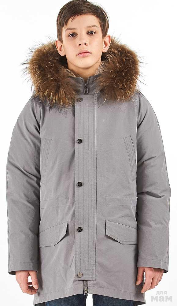 Парка для мальчика на молнии и планкой на кнопках, на груди два потайных кармана, ниже пояса два потайных кармана с клапаном. На поясе потайная кулиска. Капюшон несъемный. Мех натуральный енот ,съемный на пуговицах. Стеганная внутренняя куртка, съемная на пуговицах. Внутренний капюшон с отделкой из натурального меха кролика.