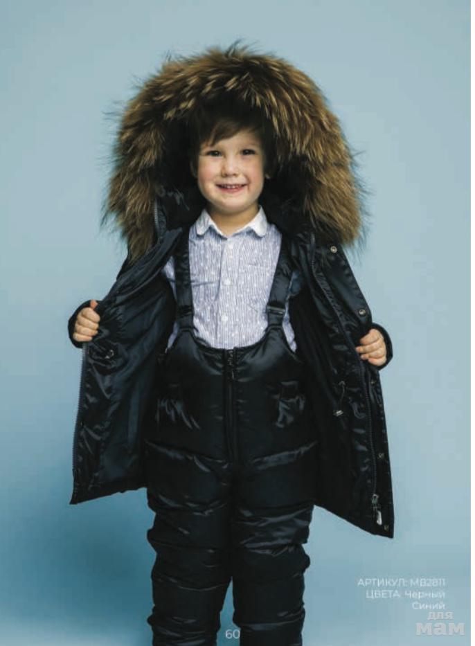 Комплект для мальчика, состоит из :стеганная куртка на молнии с тремя в точными карманами на молнии, капюшон съемный на молнии, мех натуральный енот ,съемный на пуговицах. Полукомбинезон на молнии, с резинкой на поясе и регулирующимися лямками.Флис до середины спины и в карманах.