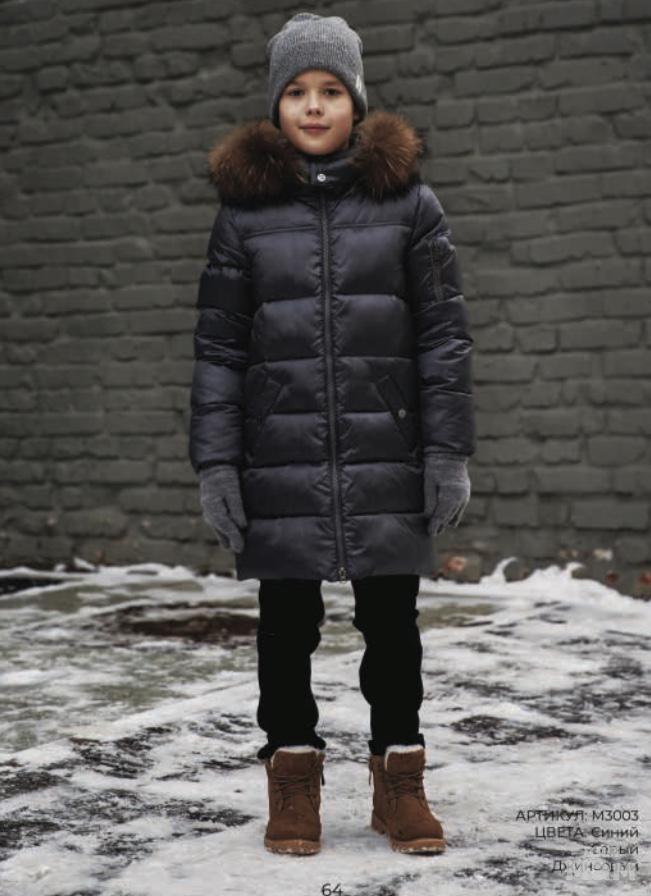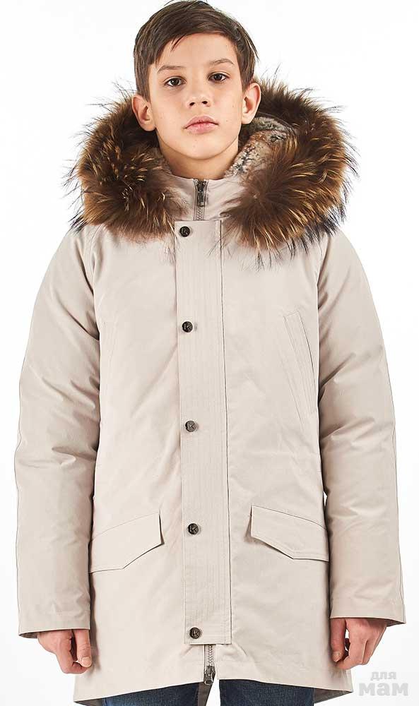 Пуховик для мальчика на молнии и планкой на кнопках, с тремя декоративными пуговицами, два кармана на груди и два накладных кармана ниже пояса. Трикотажные манжеты , капюшон съемный на молнии, мех натуральный енот ,съемный на пуговицах. Флис до середины спины и в нагрудных карманах.