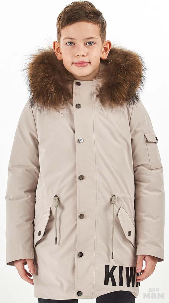 Пуховик для мальчика на молнии и планкой на кнопках. Ниже пояса два накладных кармана с клапаном на магнитах. Трикотажные манжеты.Потайная кулиска на поясе. Капюшон несъемный. Мех натуральный енот ,съемный на пуговицах. Флис до середины спины. На левом рукаве накладной карман с клапаном на магните. На спине надпись KIWILAND.