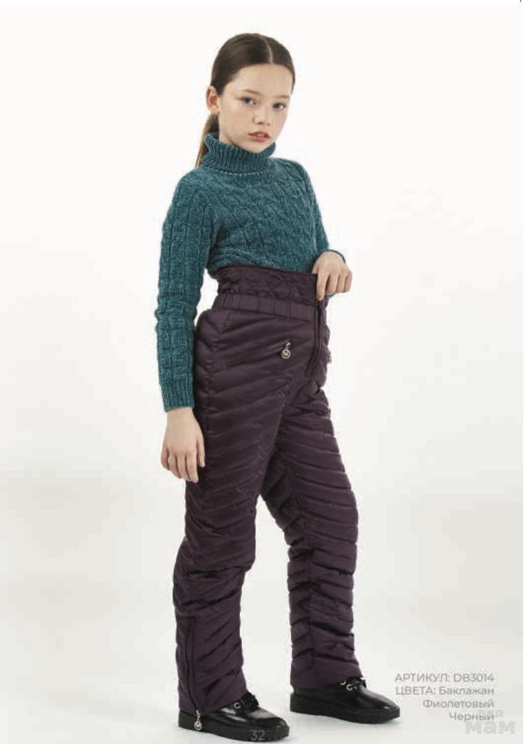 Брюки для девочек стеганные с высокой посадкой на молнии, с резинкой на поясе, два вточных кармана, имеется молния на боковом шве в нижней части брючины.