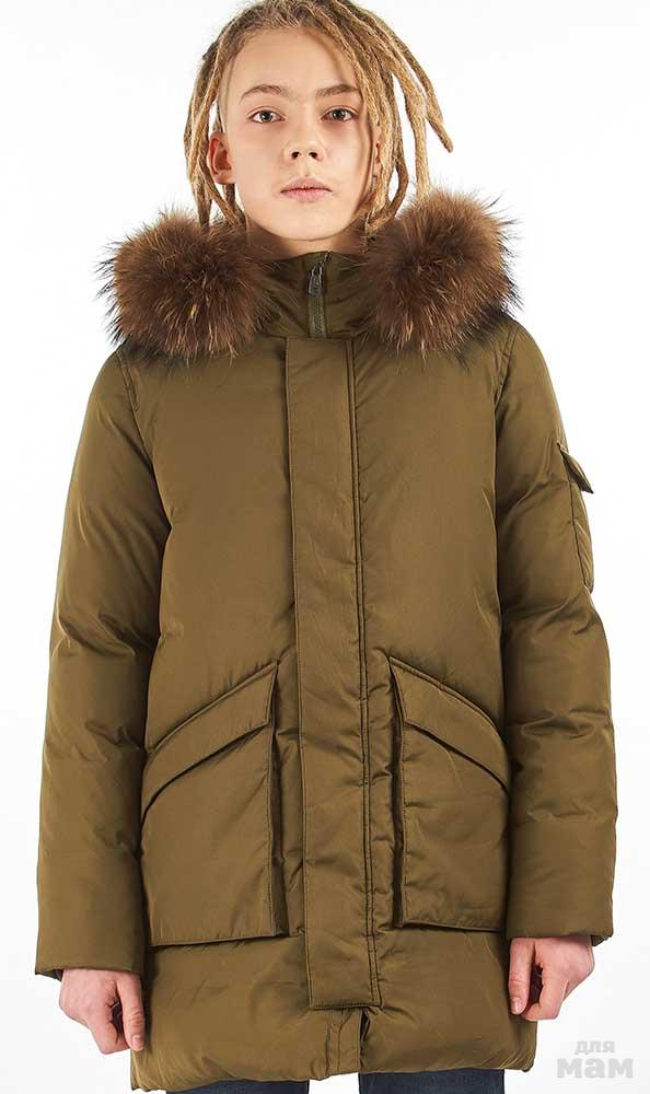 Парка для девочки на молнии с планкой на кнопках. Два вточных кармана на молнии и два потайных кармана с клапаном, потайная кулиска на поясе. Капюшон съемный со стойкой на кнопках, мех енот натуральный, съемный на пуговицах.