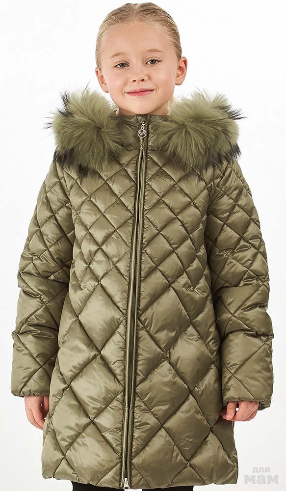 Пуховик для девочки на молнии с планкой на кнопках. Два потайных кармана с клапаном. Капюшон несъемный со стяжкой, мех писец крашеный,съемный на пуговицах, трикотажные манжеты , флисовый подклад до середины спины и в карманах.