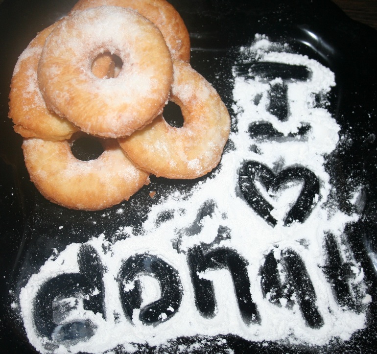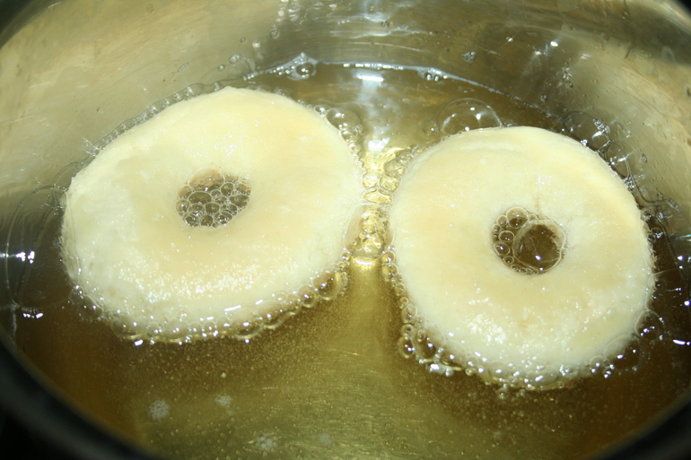 За разогревание подсолнечного масла я взялась в последнюю очередь. В обычный металлический ковшик налила 2-3 см масла и поставила греться на среднем огне. Примерно через пять минут попробовала закинуть в него несколько кружочков-серединок пончиков. К моему ужасу они сразу потонули, но уже через пару секунд надулись и всплыли на поверхность. Я сделала огонь поменьше и взялась за пончики. Сначала бросала их в ковшик по одному, но под конец уже по три и на их внешнем виде это никак не отразилось, так что не бойтесь и экономьте время :-)