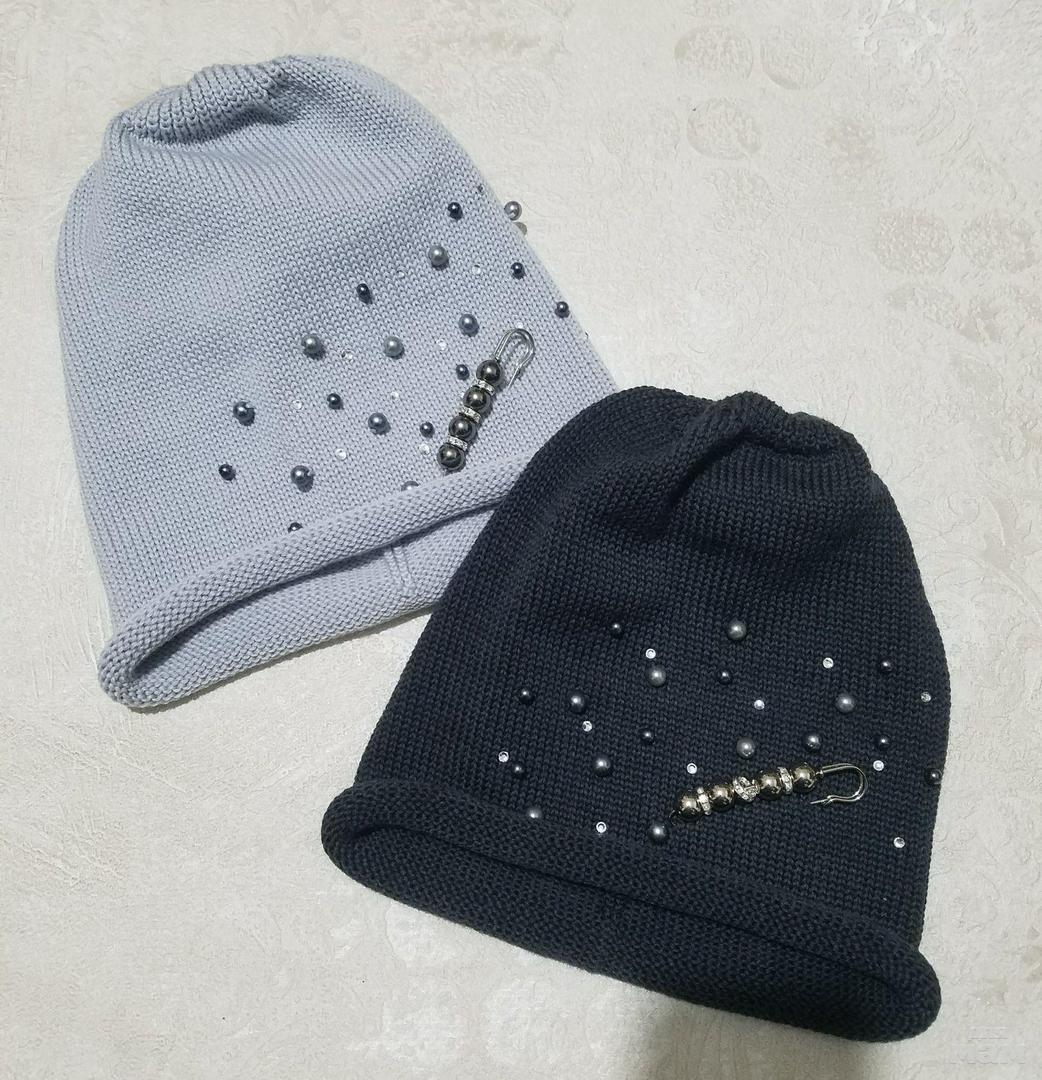 Декор выполнен из броши- булавки с жемчугом, и легкой ненавязчивой россыпи страз и жемчужин. Можно носить с торчащей макушкой - бини, можно спустить макушку назад, можно завернуть отворот и носить, как классическую модель - под любой наряд и настроение. В светло-сером цвете подойдет на ОГ 53-56+, в темно-графитовом на 53-55 - по 1300.