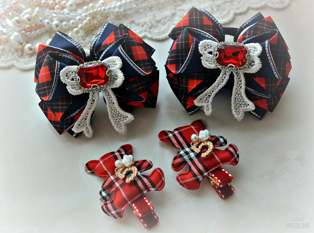 1. Бантики под школьную форму в красную клетку, можно дополнить зажимами. Бантики 480 руб пара, зажимы 200 руб.