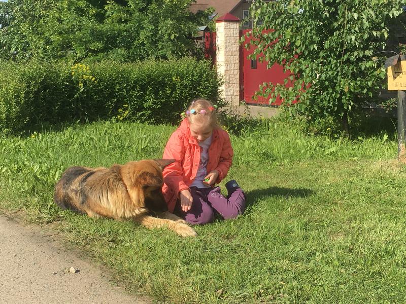 а потом вот такая собаченция забрела к нам в деревню, и целый день не отходила от нас. Сидела около забора, играла с нами, бегала за камушком и приносила его, я сначала думала, что потерялась, но вроде сказали что местная, просто зашла погостить. Мы ее очень полюбили