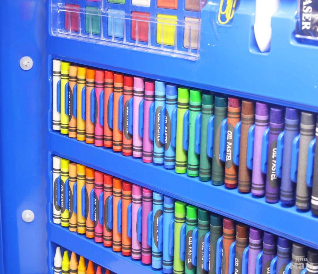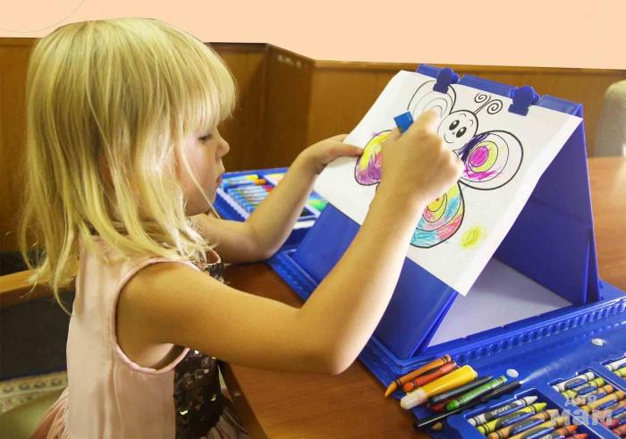 В сложенном виде кейс напоминает чемоданчик, который легко можно взять с собой в путешествие или перенести в другое место. Раскладывается просто – по принципу книги с дополнительным разворотом. Трёхсторонний чемоданчик превращается в полноценное рабочее место юного мастера! На средней вкладке имеется специальная вставка, которая трансформируется удобный мольберт. На нем можно зафиксировать лист бумаги и создавать любимые рисунки.