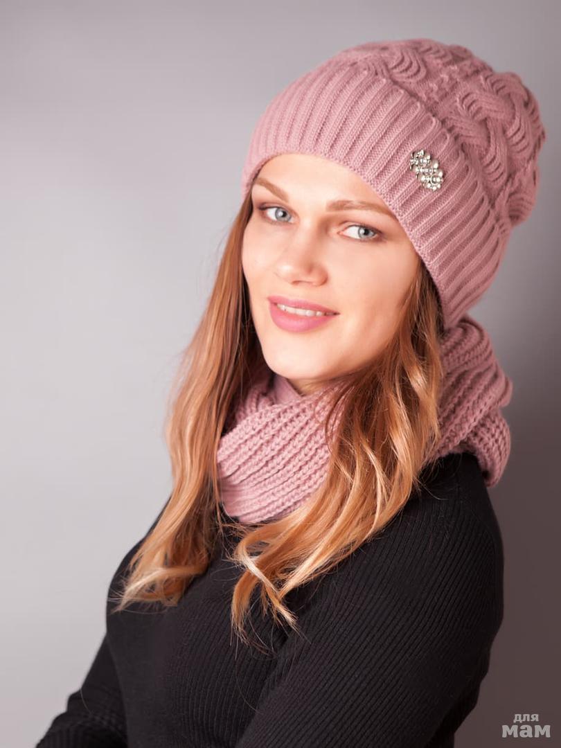 Набор шапка и снуд: шапка женская на флисе с отворотом и брошью+снуд, пепельно-сиреневый - 749 руб.