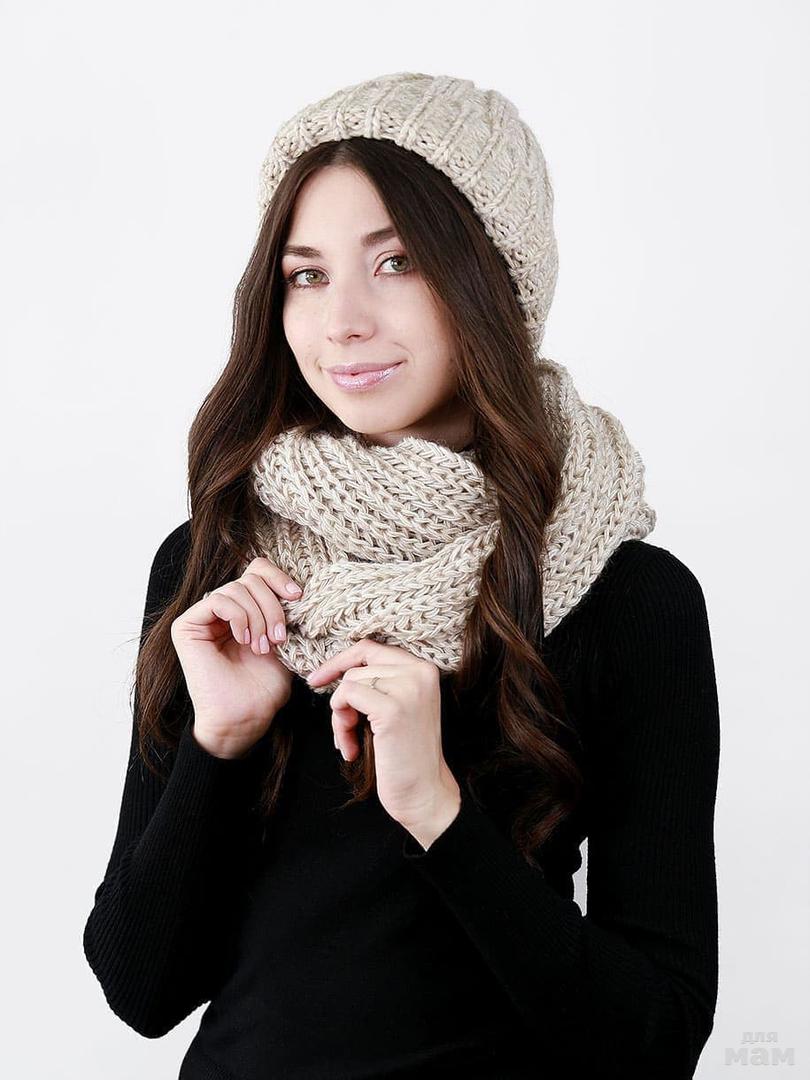 Шапка женская, крупной вязки + снуд, лапша, с отворотом, бежевый - 749 руб.