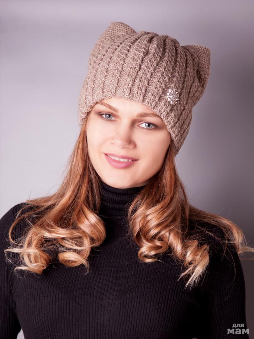 Шапка женская двойной вязки с ушками и брошью, светло-коричневый - 399 руб.